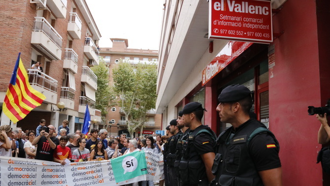 9 de setembro, dia em que a sede do seminário El Vallenc foi ‘visitado’ pela Guarda Civil. Diante dos policiais, a manifestação pacífica dos catalães: sim à democracia 9 de setembro de 2017: entre os dias 6 e 9 de setembro, a polícia vigiava as portas da empresa privada Impremta Indugraf Offset, inspecionando os veículos dos trabalhadores, bem como todas as vãs que entravam e saíam. Ainda no dia 9, a Guarda Civil esteve presente nas duas sedes da empresa privada do semanário El Vallenc, a fim de verificar se materiais ligados ao referendo estavam sendo produzidos. A inspeção durou 5 horas, e foram confiscados diversos documentos da empresa e o computador do diretor do semanário, Francesc Fàbregas, que recebeu ordem para prestar declarações, como investigado, na sede da Guarda Civil de Tarragona.